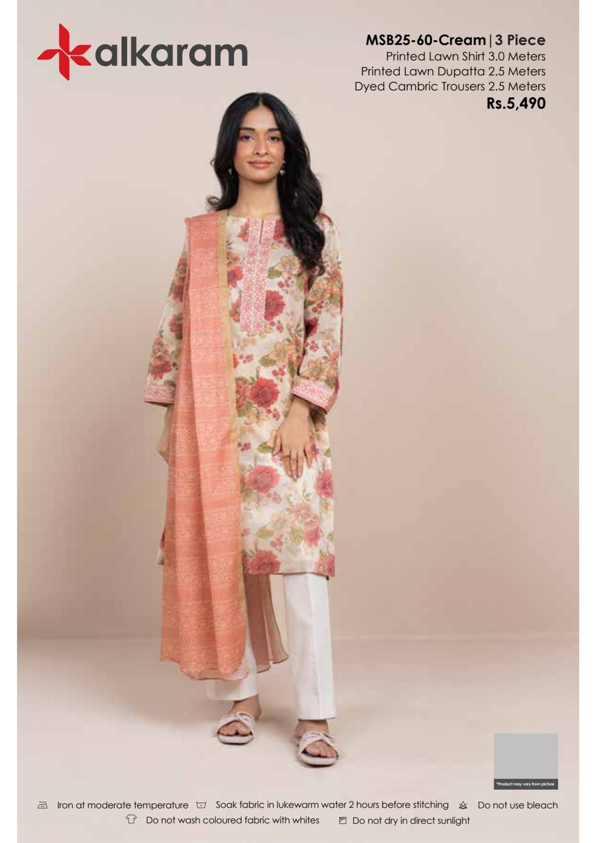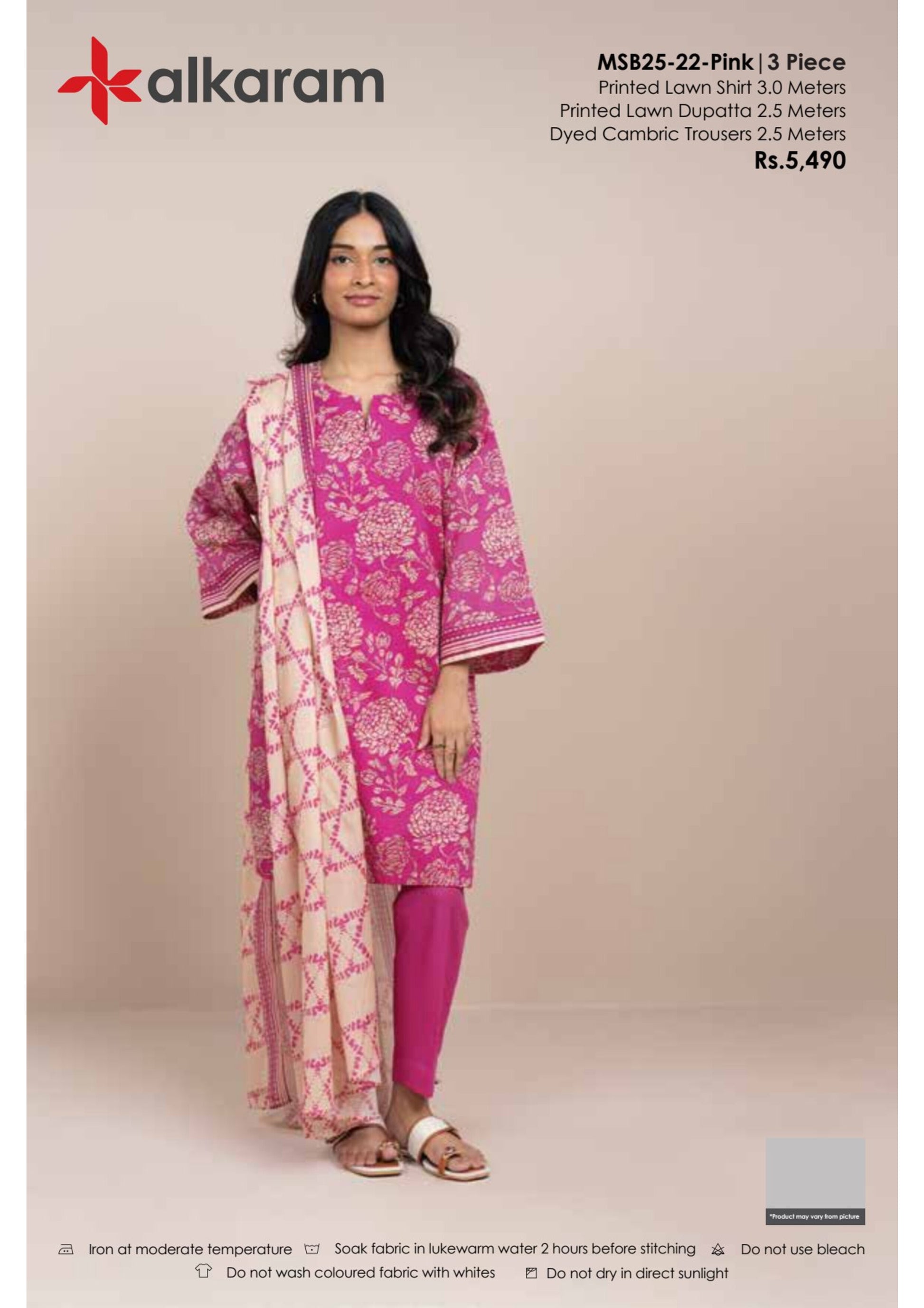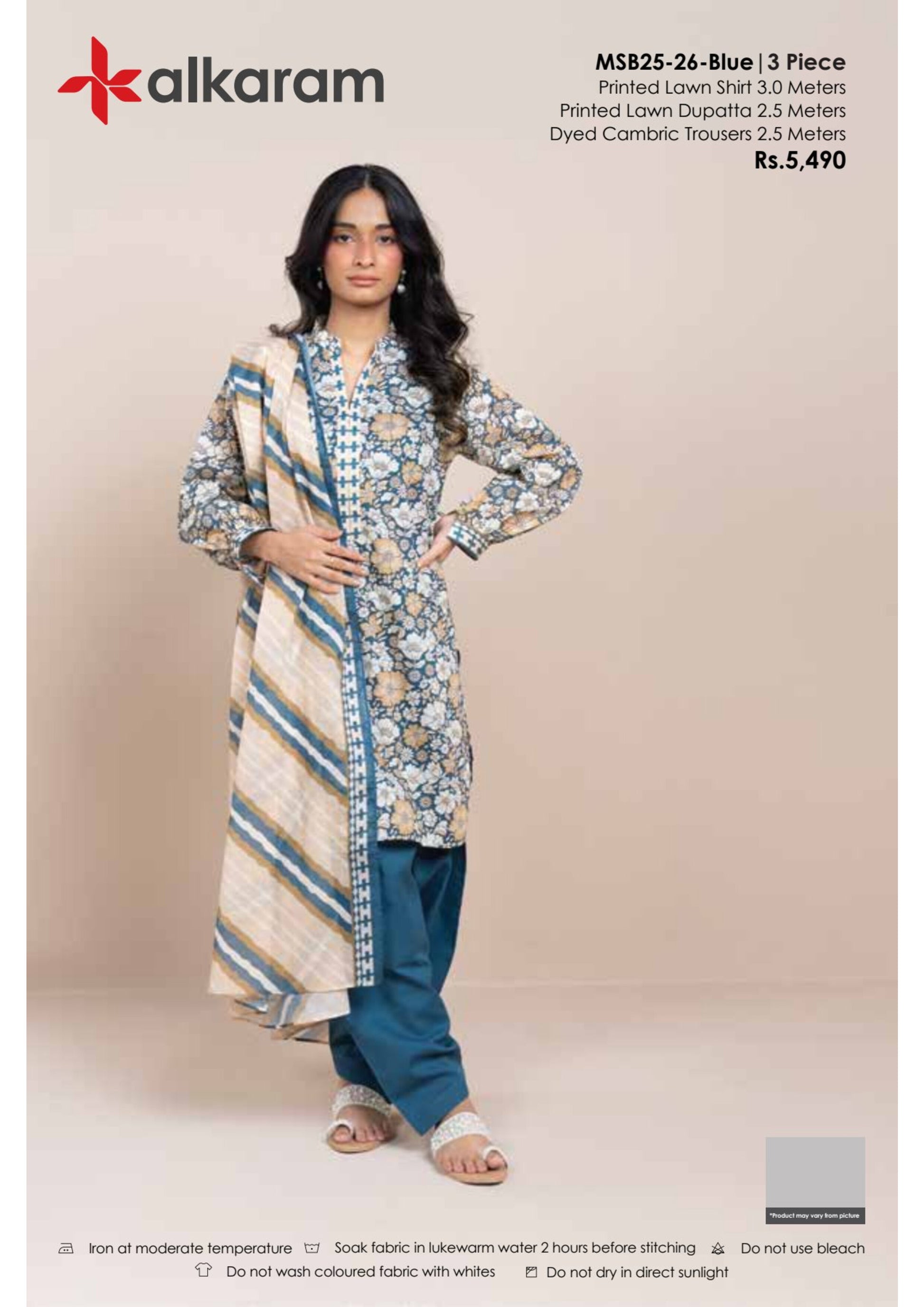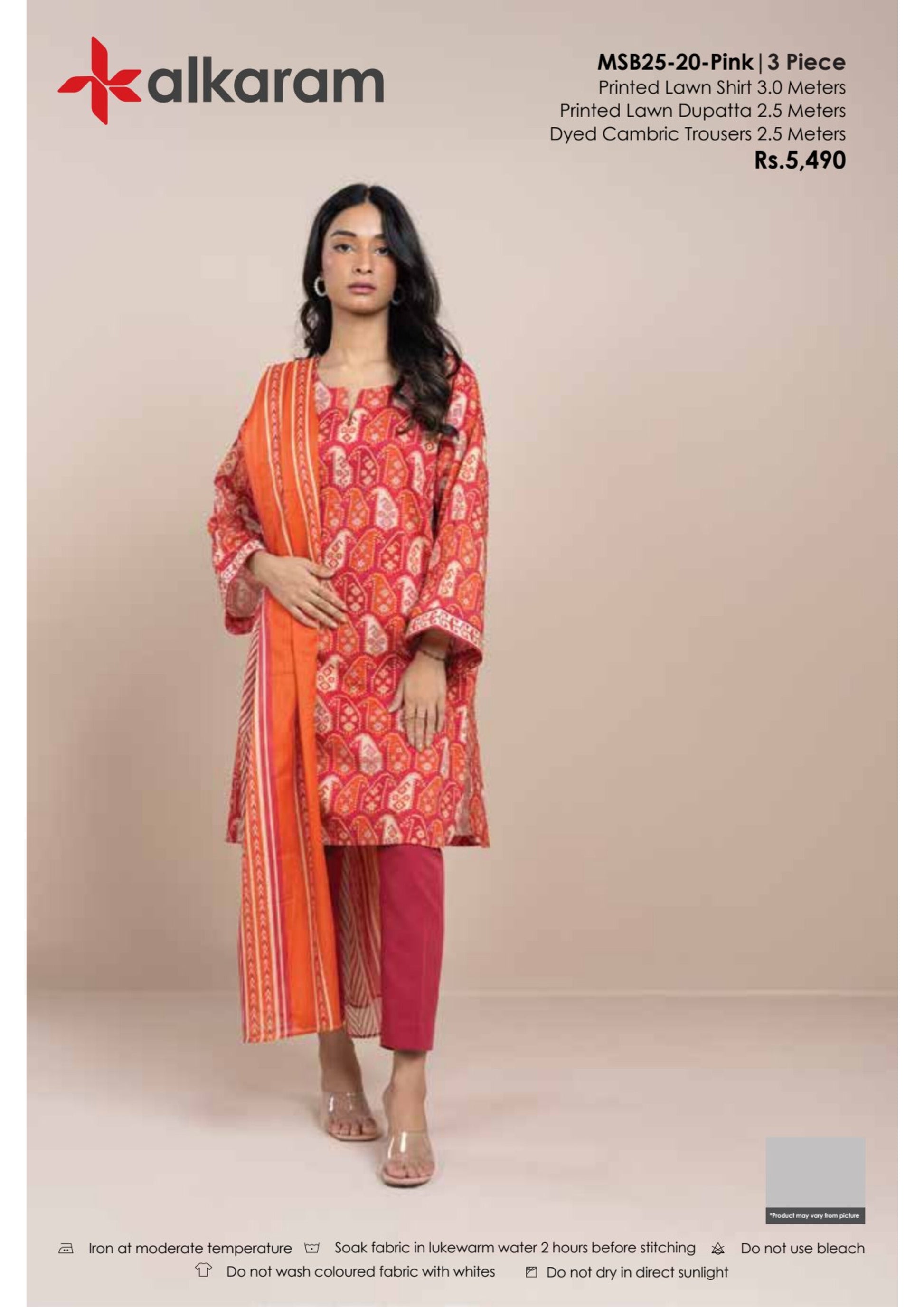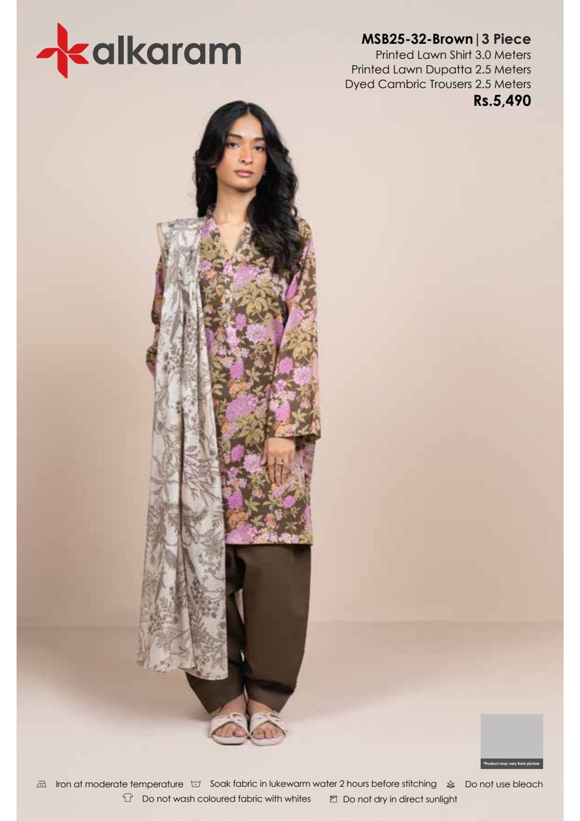 Piece Printed Lawn Shirt 3.0 Meters Printed Lawn Dupatta 2.5 Meters Dyed Cambric Trousers 2.5 Meters
