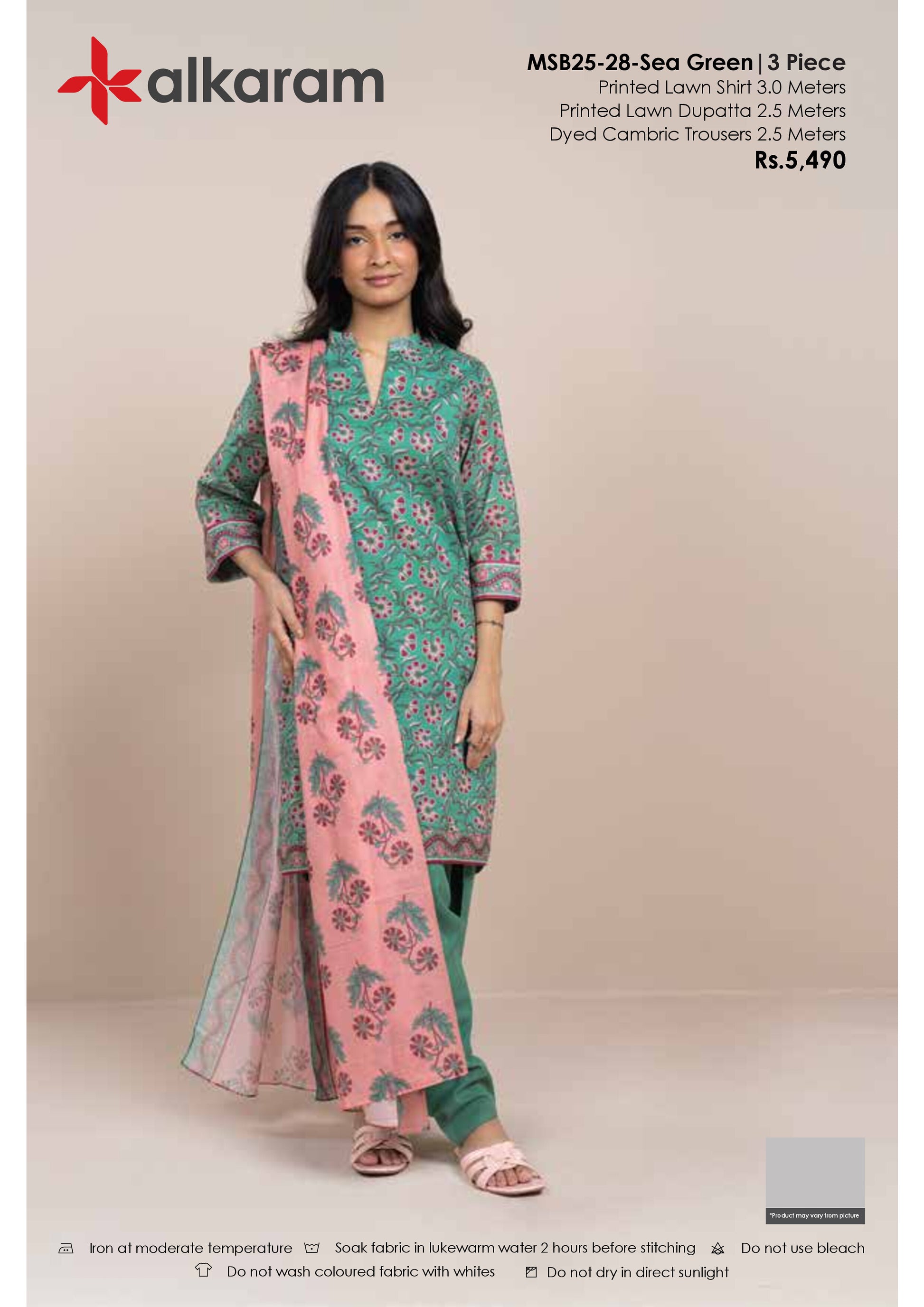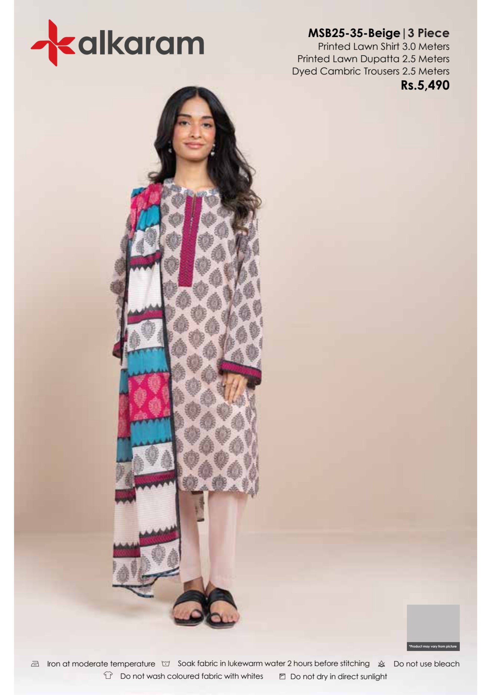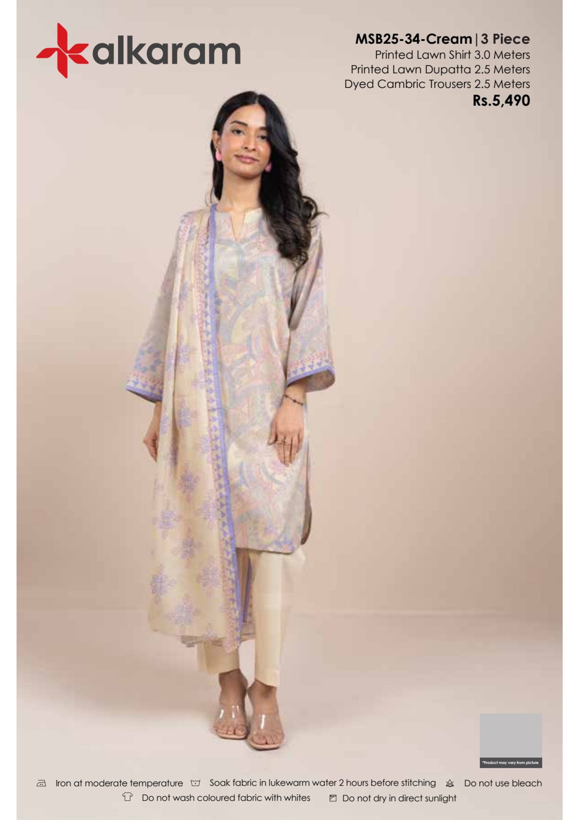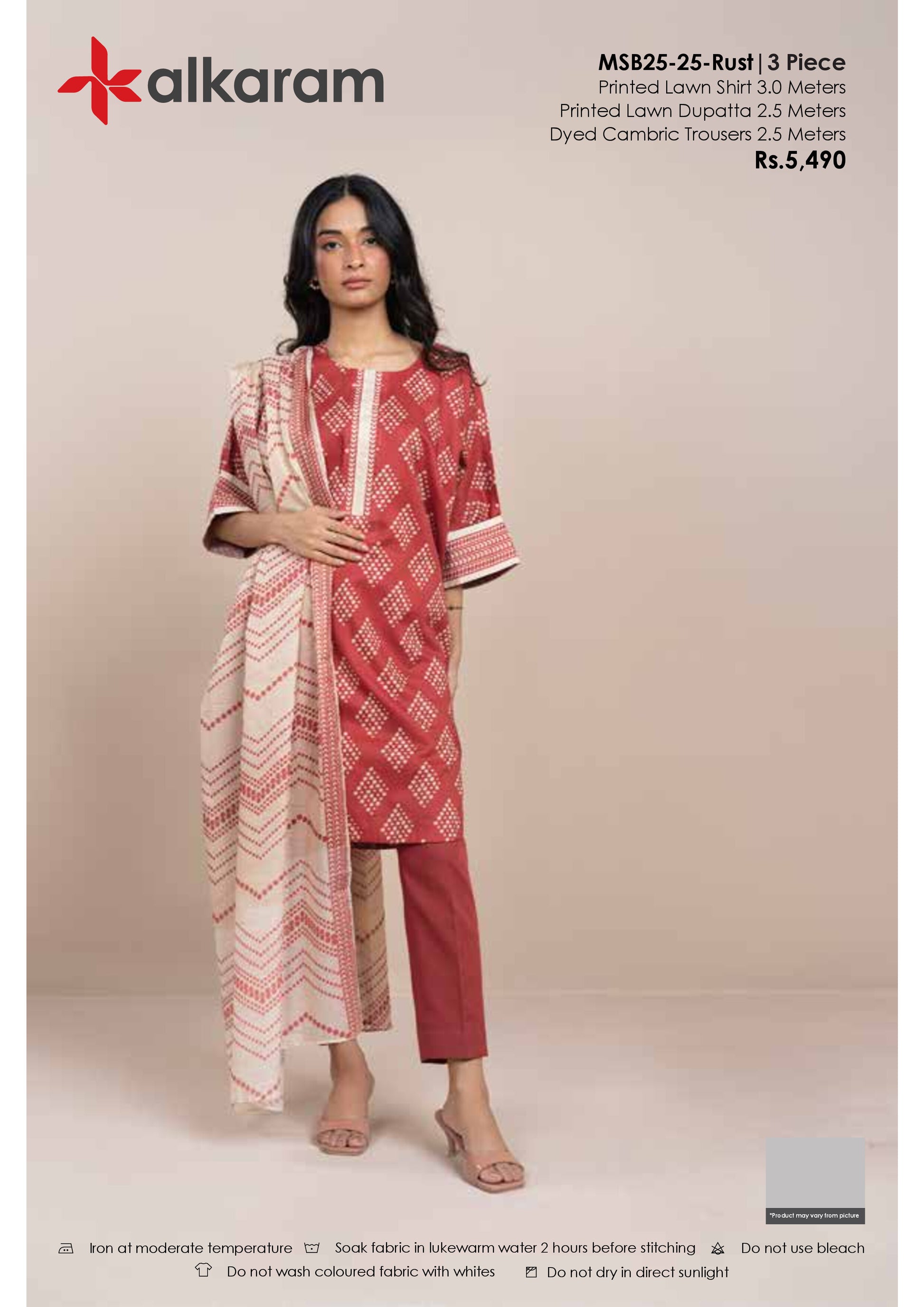 Piece Printed Lawn Shirt 3.0 Meters Printed Lawn Dupatta 2.5 Meters Dyed Cambric Trousers 2.5 Meters